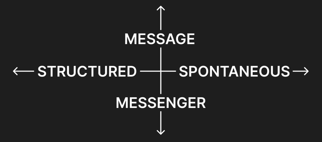 Top right: Spontaneous + Message. These are the cultural echoes. Not tied to a person, not planned, not following a template. Just something that taps into a shared feeling and takes off. A screenshot of a text that says exactly what everyoneâs thinking that week. The moment spreads because the idea behind it is too good not to share.